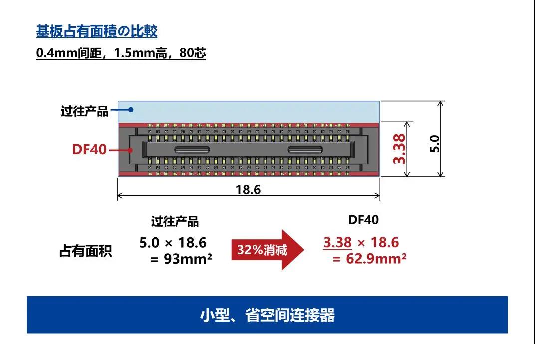 特点 1. 省空间:纵深3.38mm 2. 堆叠高度 1.5-4.0mm 3. 对应USB4 Gen.2(10Gbps)信号传输 *1 4. 有效嵌合长度长:0.45mm 5. 卓越的端子构造实现了明确的锁扣手感以及大嵌合力 6. 防止端子变形构造 7. 种类繁多(带护罩:DF40G系列,带完全锁:DF40GL系列,ADAS:DF40T系列) 8.核心数量从10到120核心变化巨大 9.用导向肋确保自动对准:0.33mm 10.防止镍阻挡层焊接的结构 11.还提供用于生产线检查的高度耐用的连接器* 只有H=1.5 mm的产品支持Type-C DF40系列变体